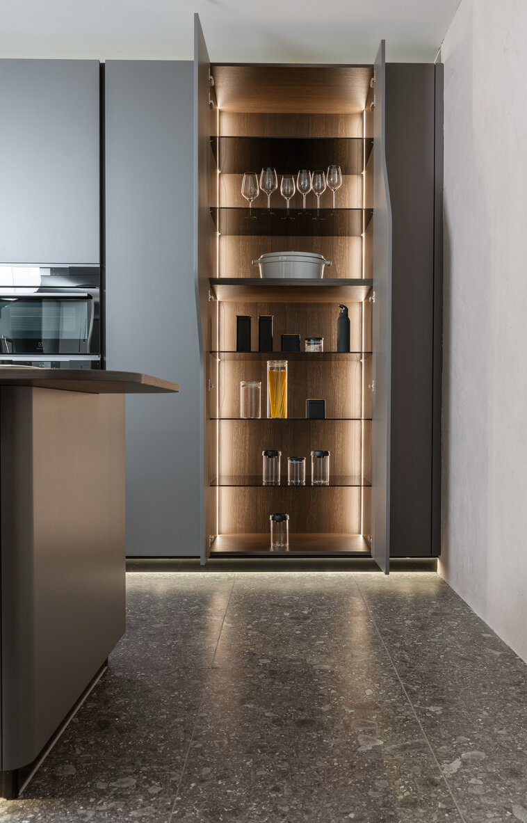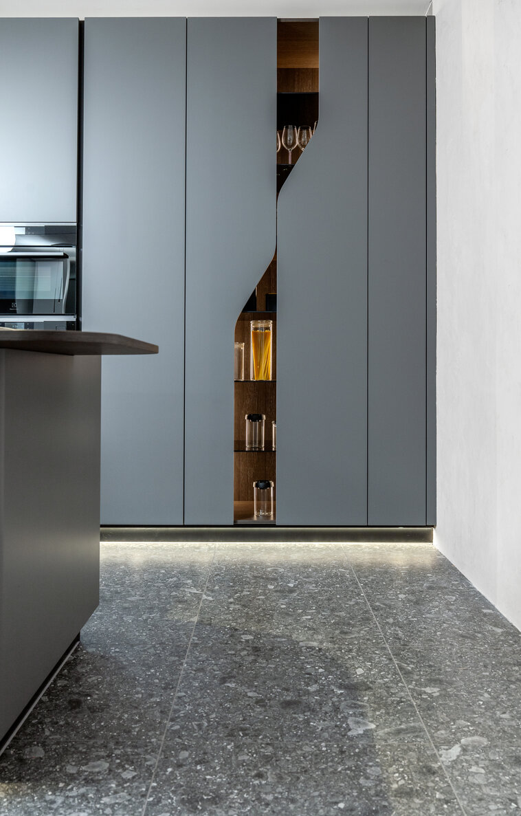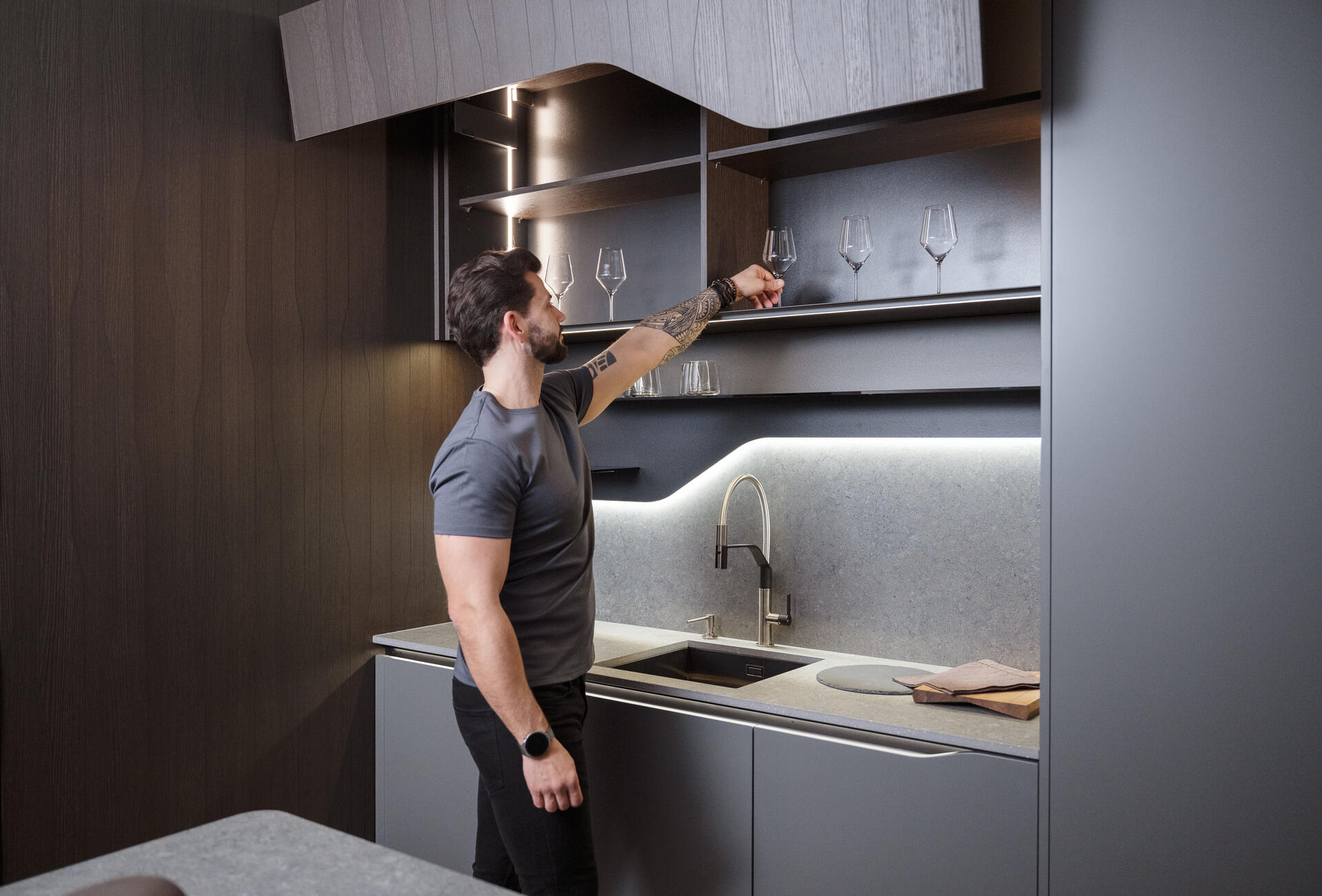 Temné odstíny Onyx Grey kombinované s laminem Dub Notturno Stream vytvářejí futuristický vzhled, který oživuje systém LED osvětlení probíhající celou sestavou. Lakovaná dvířka v profilu FLUID jsou navržena tak, aby vytvářela organické, plynoucí linie, které připomínají vlnění.