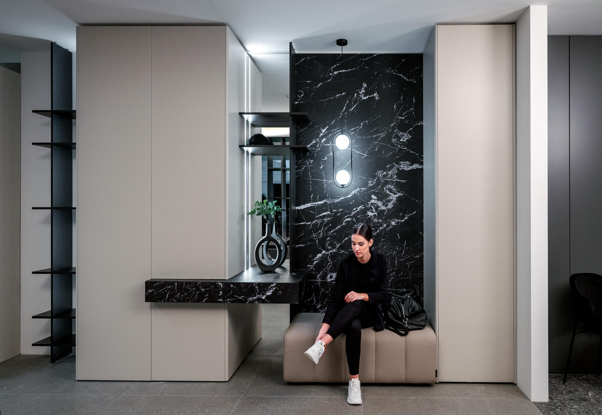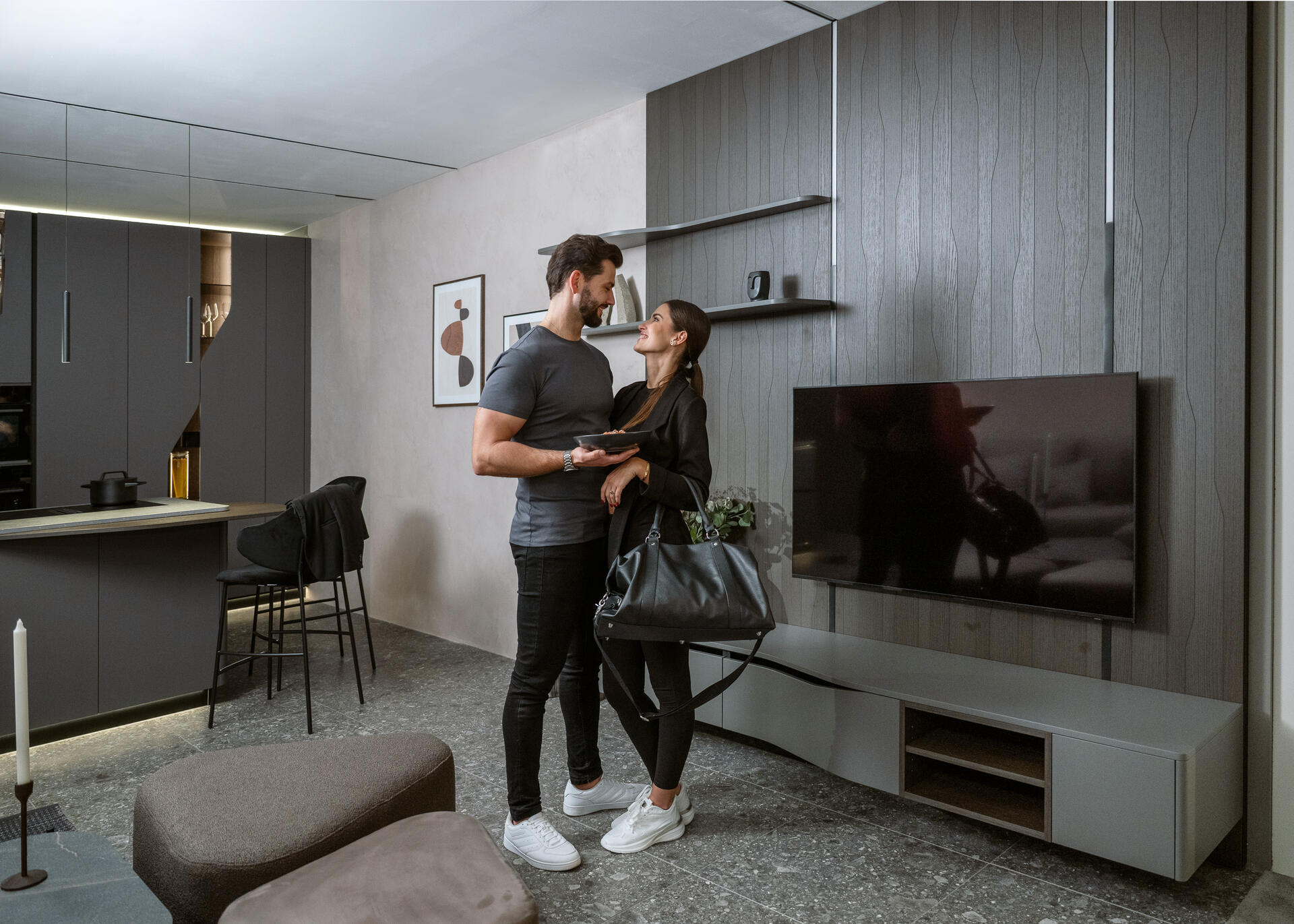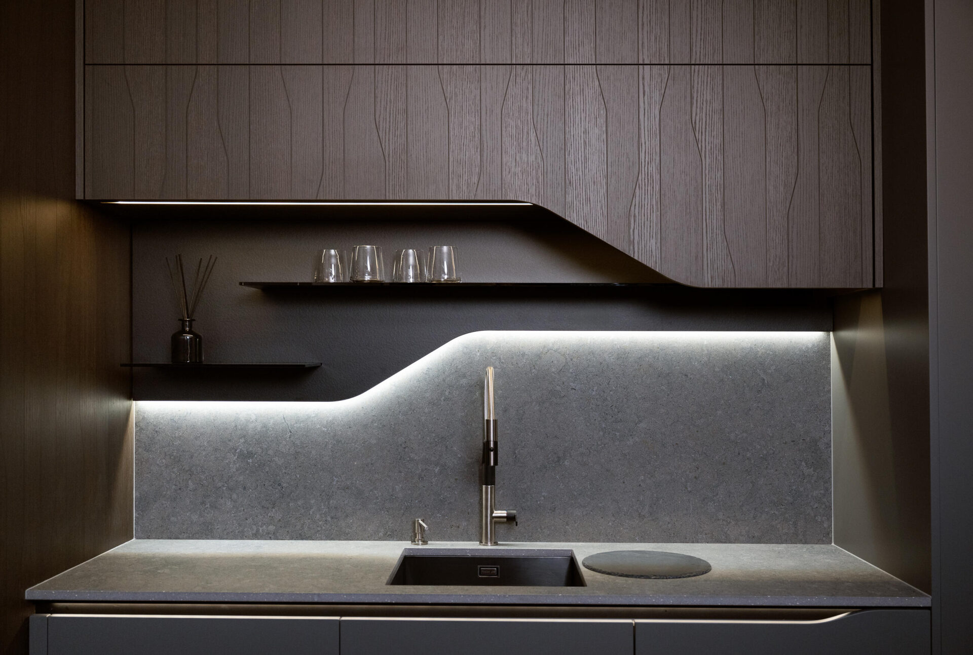 Temné odstíny Onyx Grey kombinované s laminem Dub Notturno Stream vytvářejí futuristický vzhled, který oživuje systém LED osvětlení probíhající celou sestavou. Lakovaná dvířka v profilu FLUID jsou navržena tak, aby vytvářela organické, plynoucí linie, které připomínají vlnění.