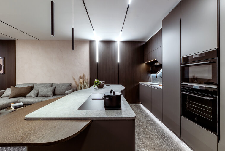 Tento tvarovaný prvek se harmonicky opakuje v kuchyni i na obývací stěně, což přispívá k jednotnému a plynulému vzhledu interiéru.